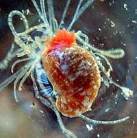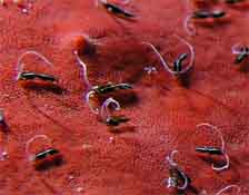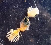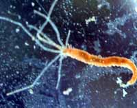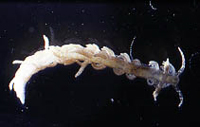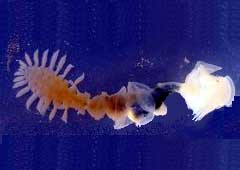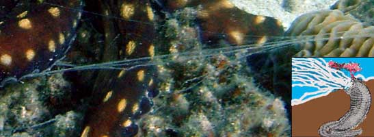 תולעת שואבת Chaetopterus sp. "Parchment-tunnel worm" תולעים החיות בתוך מחילת-נרתיק על הסלע והן מעבירות כמויות מים דרכה למזון על הגוף "סנפירים" היוצרים מעין משאבה המניעה את המים worms living in paper-like tunnels on rock moving water through it, using their flaps as pump Det: Dr. Mary E. Petersen |