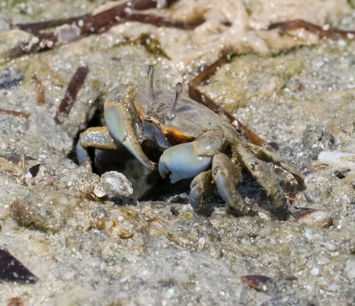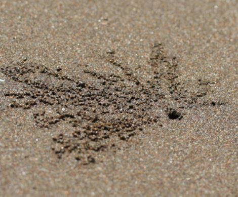 סרטנים קצרי בטן החיים בבתי גידול חולייים, כשהם מתחפרים בתוך החול בעת הגאות Sandy shore dwelling crabs digging burrows into the sand to hide during high tide |