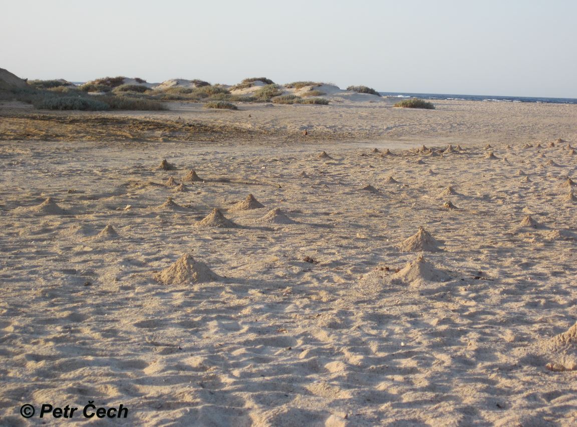 | חולון Red Sea Ghost crab Ocypode saratan (Forskal, 1775) הסרטן הזכר בונה תלוליות חול כסמן טריטוריאלי The male builds sand pyramids as territorial marker. | ||