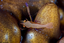 | דיירית מלפפוני-הים Emperor partner shrimp Zenopontia rex (Kemp, 1922) Formerly Periclimenes imperator (BRUCE, 1967) חי על גבי מלפפוני-ים וחשופיות גדולות Lives upon sea-cucumbers (R) and Spanish Dancer slug (L) |