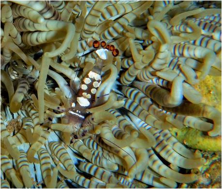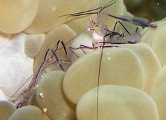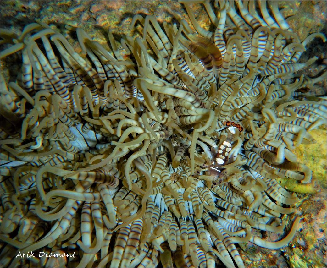 Partner shrimp Ancylomenes longicarpus (Bruce & Svoboda, 1983) חי על גבי שושנות-ים גדולות Lives upon large sea-anemones |