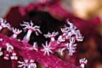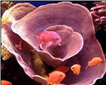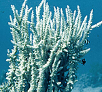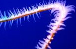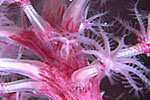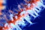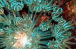 To the Hexacorallia belong also the sea-anemones, and flexible corals such as Antipatharia and Zoantharia. The second group, Octocorallia is easily differentiated by the (always) eight tentacles of the polyps. They include the soft corals, whose skeletons consists of calcareous needles (sclerites) embedded inside the animals inner tissue (Mesogloea); gorgonians, flexible skelton consist of a inner flaxible core made of plastic-like Gorgonin, and some skelton-less feather corals. The scientific term ahermatypic (non-reef builder) is applied to them. |