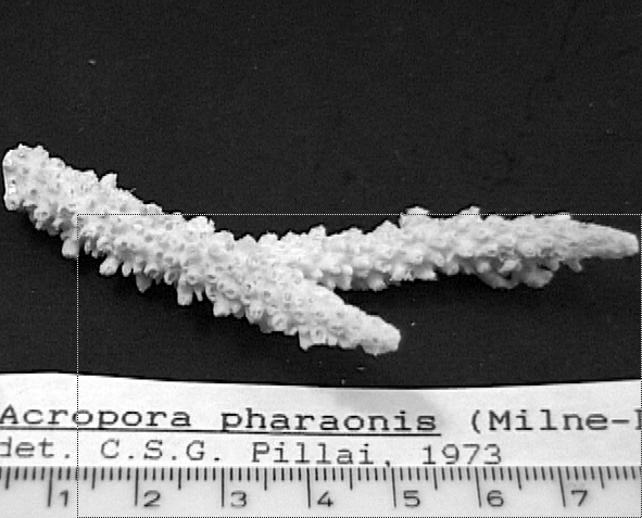 שיטית פרעונית Acropora pharaonis (Milne Edwards & Haime, 1860) קב' 18 סימן בולט: ענפים מוצקים, ענפים מתאחים ומצטופפים ללוחות ים סוף ומערב אוק' הודי Synonyme of A. scandens Accepted by WoRMS |