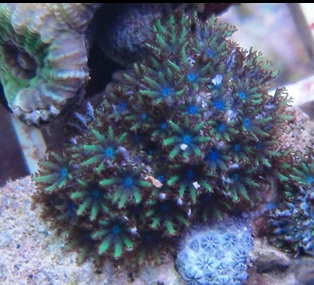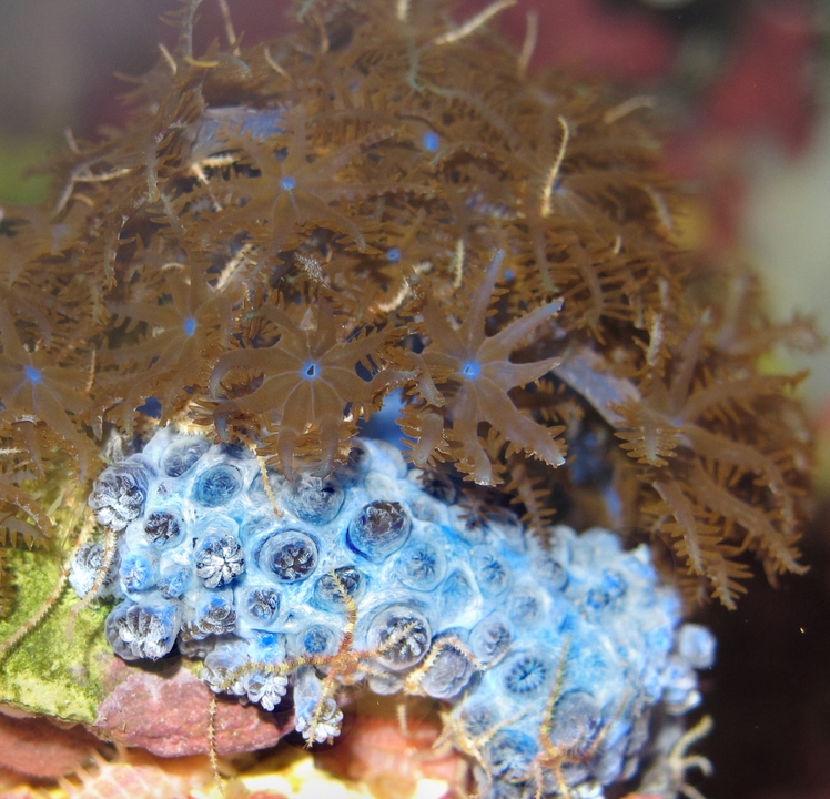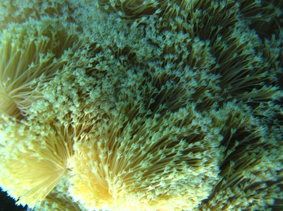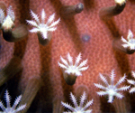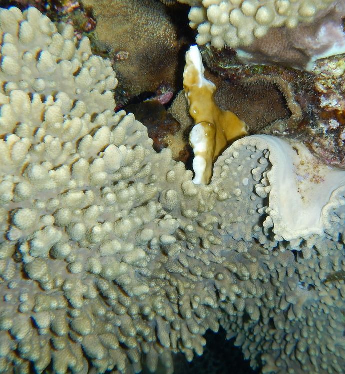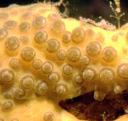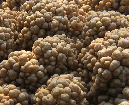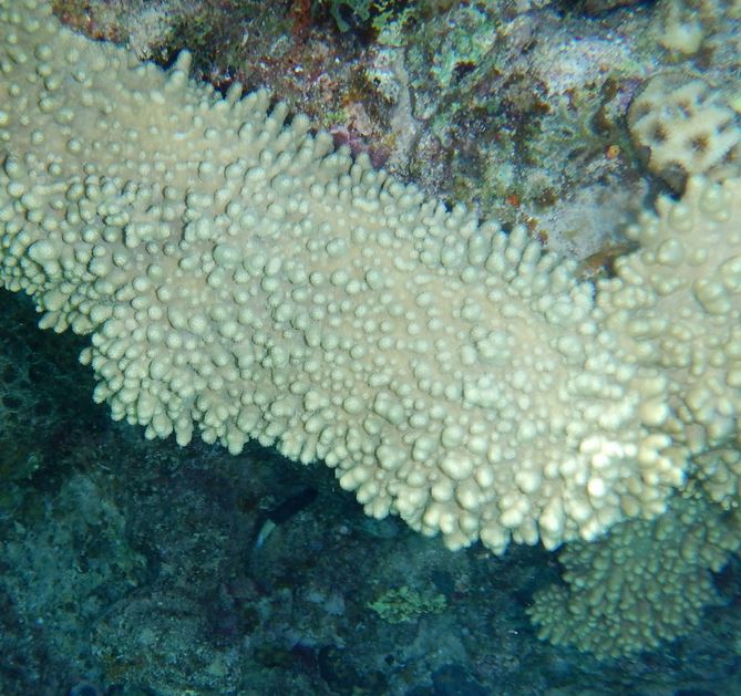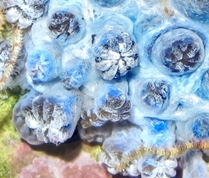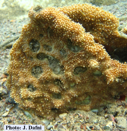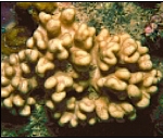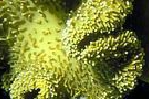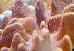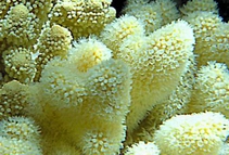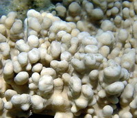 Alcyoniidae is a family of leathery or soft corals in the phylum Cnidaria. A colony of leathery coral is stiff, hard and inflexible. It is composed of tiny polyps projecting from a shared leathery tissue. Members of the family may have two kinds of polyps; the autozooids have long trunks and eight tiny branched tentacles and project from the shared leathery tissue while the siphonozooids remain below the surface and pump water for the colony. They appear as tiny hollows or mounds among the taller autozooids. Different genera have different proportions of these two kinds of polyps. The autozooids only emerge when the colony is fully submerged. .Leathery coral polyps include zooxanthallae. The algae photosynthesize and produce sugars from sunlight. Periodically, the surface layer of the leathery tissue is shed. This seems to be a mechanism for ridding the colony of unwanted algal growth. (Source: Wikipedia) Sclerites include tuberculate, pricky spindles, clubs 6-8 radiates, oval and dumbbells (Source: Fabricius)
