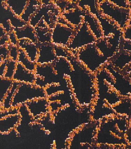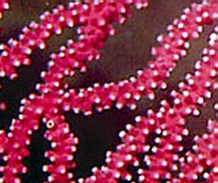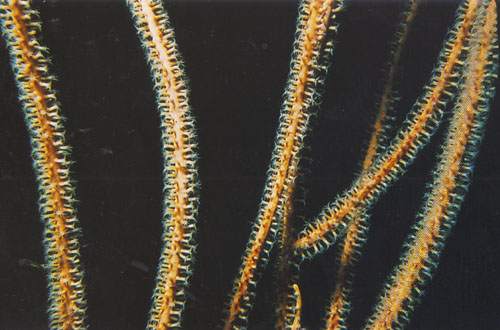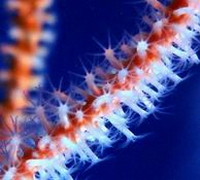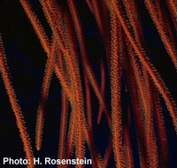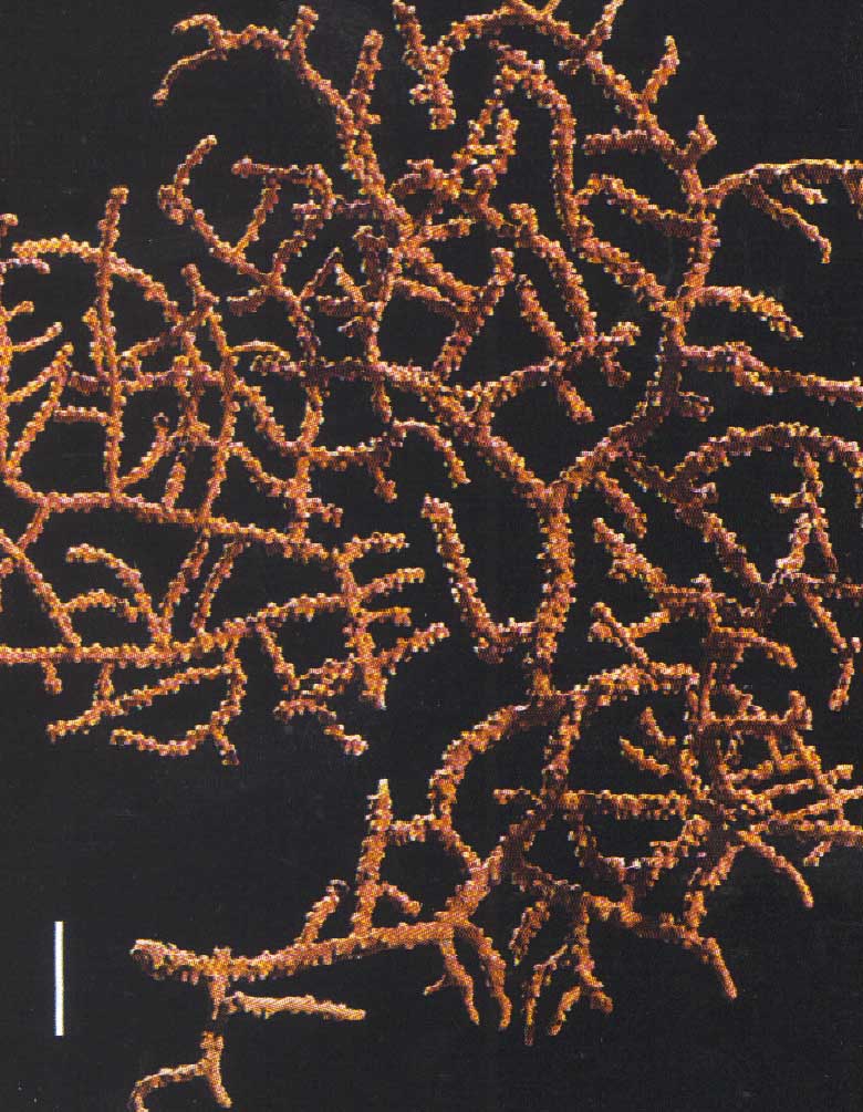 in whichthe fewbranchesnear thecolonyarebased.Its flexible, horn-likeaxial skeleton consists of an innerand an outerMedulafromGorgon-like barkcortex, whichis heavily calcified.The medullaistheCoenenchyme covered,from which theeight-rayedpolyps grow.The polypsaresmall and numerous.InCoenenchyme sitsmall,only0.1 mmlong, dumbbell-shapedsclerites Ellisellidaegenerausuallyhave a redororange color (Wikipedia)