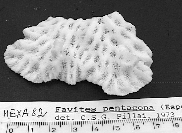 מחומשת Favites pentagona (Esper, 1794) small size, angular. green oral disc קטן, 6-10 ממ מזוות וצבע משטח הפה ירקרק גם בעומק*** תפוצה אוק' הודי-פציפי Accepted by WoRMS |