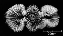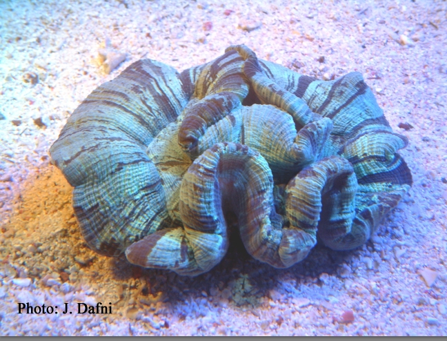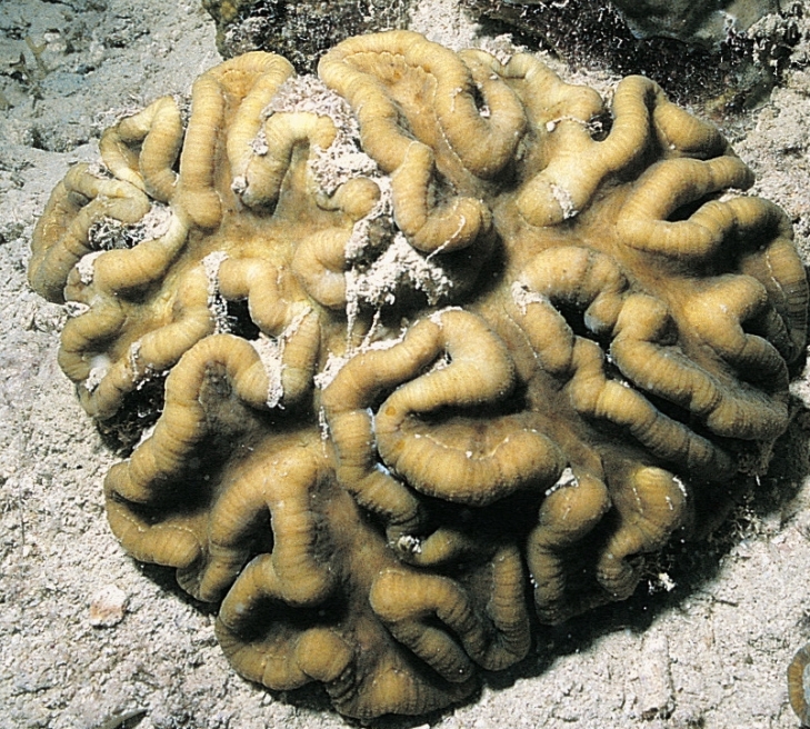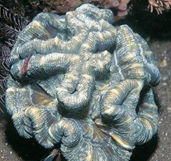 | Merulinidae Verrill, 1865 משפחת אלמוגניים GenusTrachyphyllia סוג שובל-שמלה Trachyphyllia מקודם חולן במשפחה ובסוג רק מין אחד. מושבה שאיננה מאוחה, אלא מונחת על החול חופשית. הפוליפים מסודרים בשקעים מפותלים שהגבולות בין פוליפים סמוכים לא ברורים תמיד Only one genus and one species for this family. The colony is free-living, with several corallites in a flabello-meandroid type colony. |