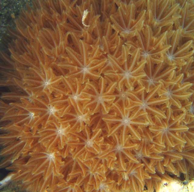 אלמוג קרומי חום-בהיר (מכיל שתופניות) המרפד את המצע הפוליפים בצבע חומים-קרם, בחניניהם עדינים