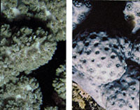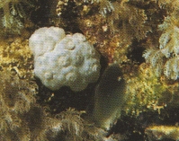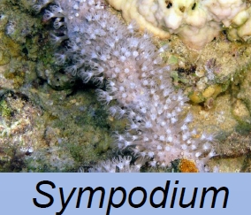 סימפודיום Sympodium spp. אלמוג קרומי המרפד את המצע. הפוליפים אפורים-ירקרקים. הסוג היחיד שמכנס את הפוליפים בעת סכנה (ימין). נדיר. נרשם מעקבה