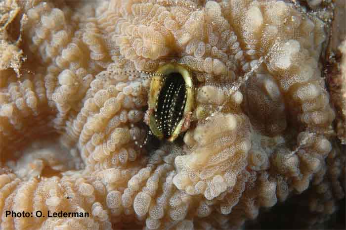 דר-אלמוג גדול cf Nobia grandis Sowerby, 1839 טפילים-שתופנים על אלמוג אבן Parasite-symbiotic with the coral Diploastrea .WoRMS Accepted |