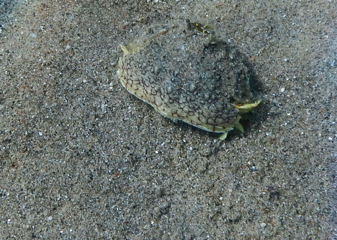 ביישן ים-סופי Box crab Calappa hepatica (Linnaeus 1758) סרטן מתחפר, המסתיר בצבתותיו את חזותו Burrowing crab, hiding its front with its large chela |
