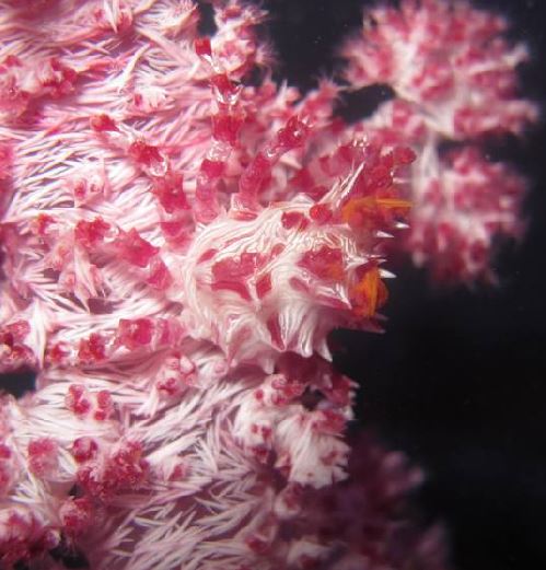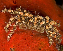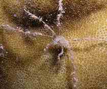 עכובית ריסנית מכוסה בספוג המכיל פוליפים של המדוזה Eyelash spider crab cf Schizophrys aspera with a Mycale sponge, with the jellyfish Nausithoe punctata polyps Inset: individual polyps Photo: B. Tamir |