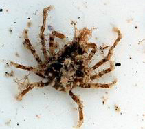 עכובית דקת רגל Camouflaged Spider crab Achaeus spinosus סרטן המלביש על רגליו וגופו עצמים שונים להסוואה Camouflaged spider crab Photo: M. Meller, M. Levin, I. Ben-Tov (Eilat) |