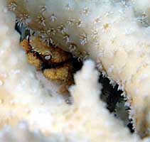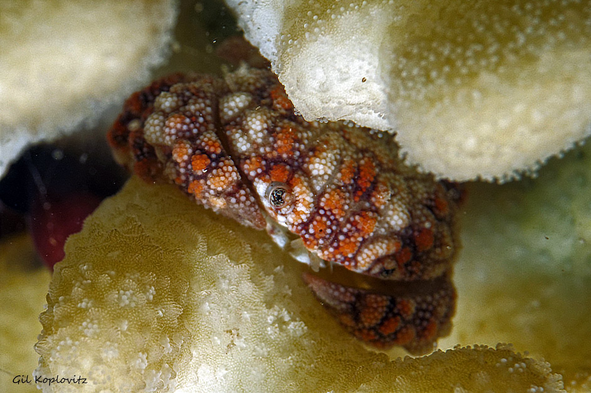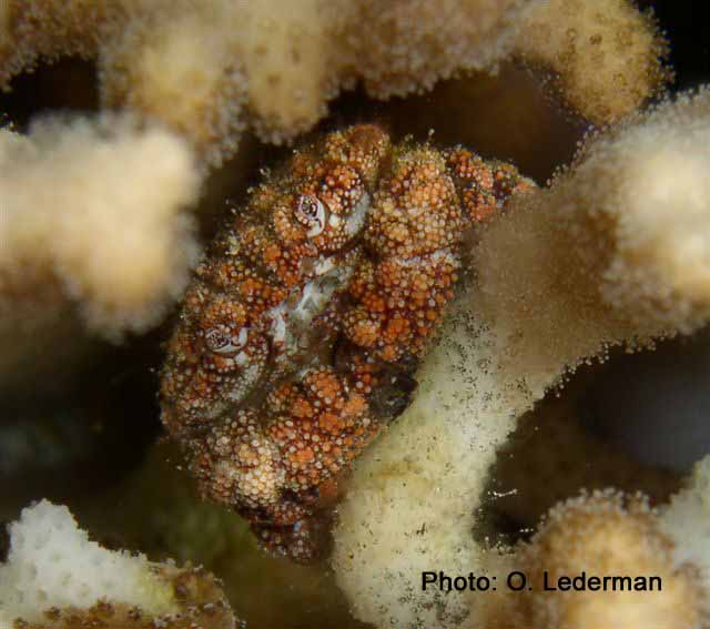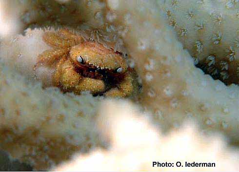 סלען Boxer crab among Acropora branches possibly Platypodia cf. granuloma (Ruppell,1830) בין ענפי האלמוג שיטית |