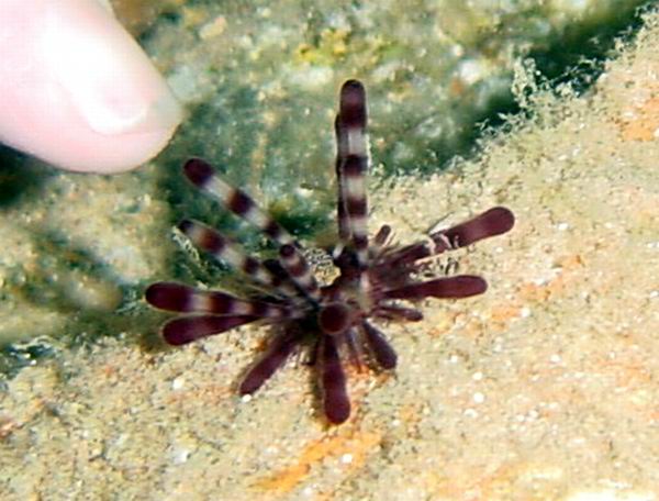 Middle size. long thin spines, showing dark and light coloration. Ambulacral areas are star like. .
