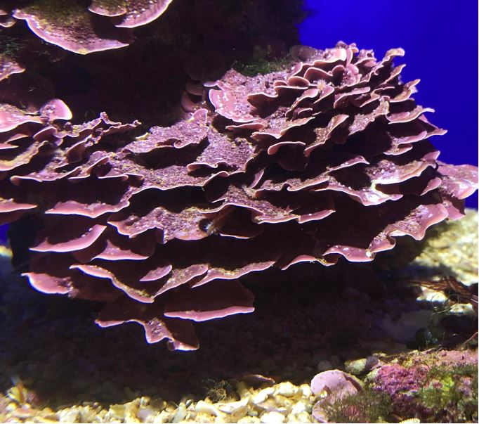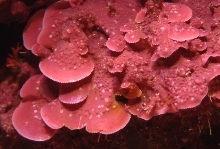Lithophyllum sp. Grows among corals in the coral reef. גדל בסביבת השונית לפעמים בין האלמוגים ומכסה שטחים |