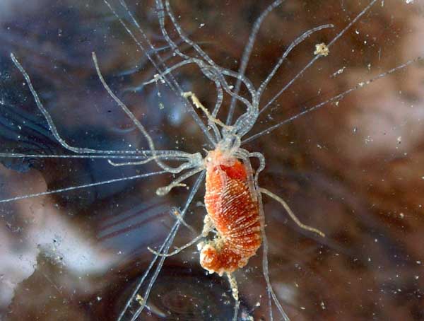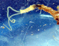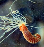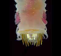 תולעת שואבת Chaetopterus sp. "Parchment-tunnel worm" תולעים החיות בתוך מחילת-נרתיק על הסלע והן מעבירות כמויות מים דרכה למזון על הגוף "סנפירים" היוצרים מעין משאבה המניעה את המים worms living in paper-like tunnels on rock moving water through it, using their flaps as pump Det: Dr. Mary E. Petersen |
